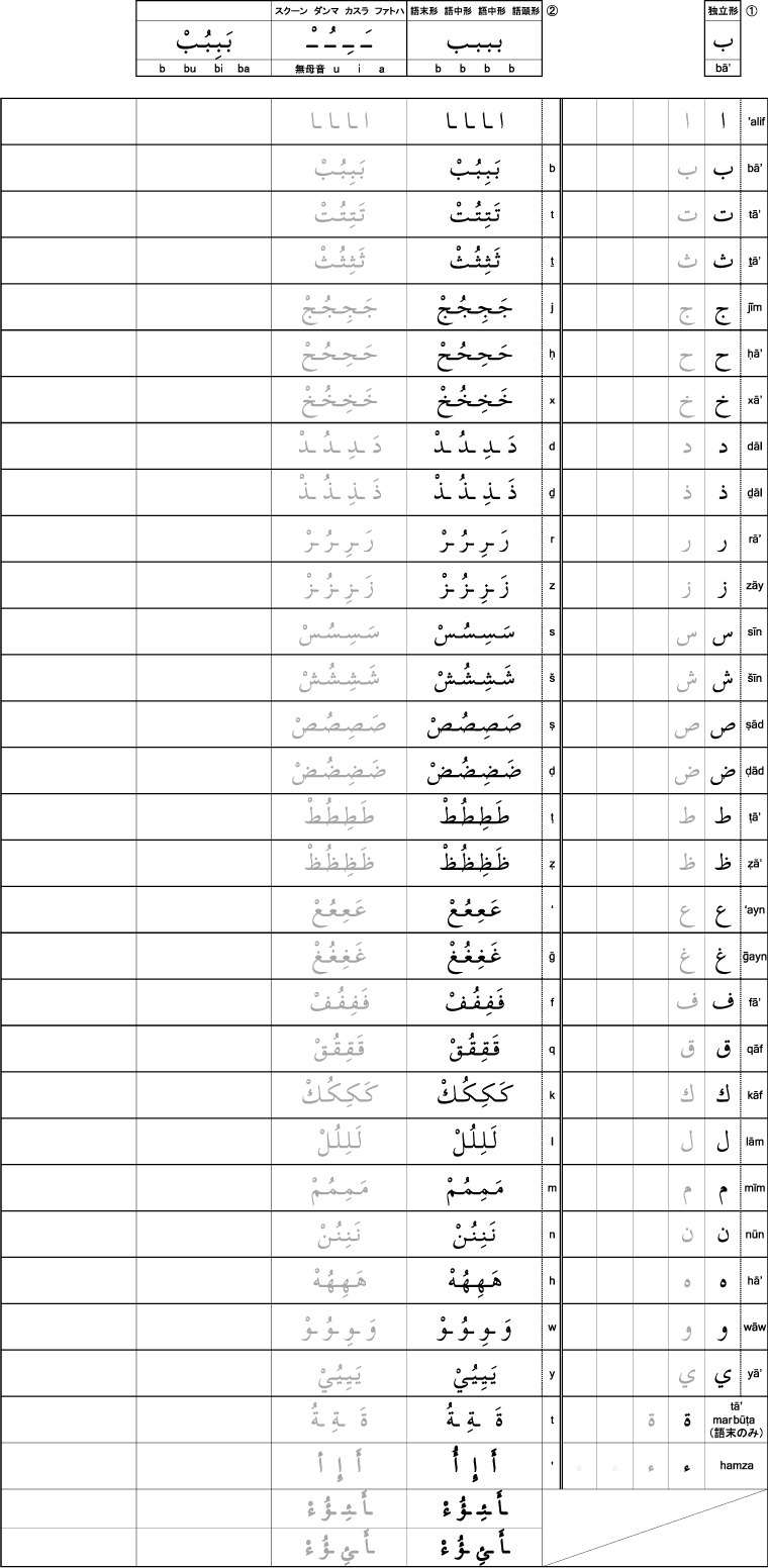文字と母音記号 (独立形・接続形・短母音) (1)まず文字名を発音しながら、独立形の文字を書きましょう。 (2)次に語頭形・語中形二つ・語末形を書き、それぞれに母音記号のファトハ・カスラ・ダンマ・スクーンを付けましょう。 この時、文字が表わす子音と、母音記号が表わす母音を組み合わせて発音してみましょう。