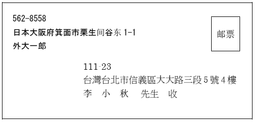 台湾式の書式では、横書きの封筒の場合、受取人と差出人を書く位置が中国語式とは異なる。台湾式書式の横書きでは、受取人の情報を郵便番号、住所、氏名の順に、封筒の右下に書く。なお、台湾の郵便番号は3桁+2桁である。郵便番号は郵便局のウェブサイトで住所から調べることもできる。差出人の郵便番号、住所および氏名は封筒の左上に書く。