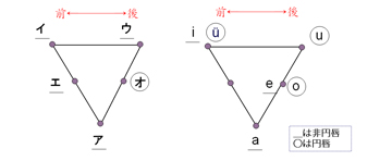「ア、エ、イ」を繰り返してみて、口の中の空間が「広い、中くらい、狭い」となっていることを確かめてみてください。それぞれ広母音、中広母音、狭母音と呼ばれます。 中国語の単韻母を日本語の五母音と比較したものを図示すると次のようになります。