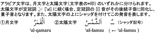以下のアラビア文字の一覧表を見てください。アラビア文字のアルファベットは「アリフ」から「ヤー」までの28文字です。この他、「ター・マルブータ」という語末に現れる文字と、「ハムザ」という声門閉鎖音を表す記号が、アラビア語の表記に使用されます。アリフを除く各文字は子音を表し、文字名の最初の子音がその音価となります。各文字について、(1)文字名 (2)4種類の文字の形(独立形・語頭形・語中形・語末形) (3)発音をおぼえましょう。