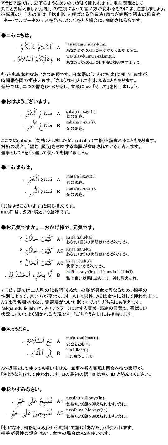 友人同士の二人が異なる時間帯に通りで出会い、あいさつを交わします。時間帯によって異なるあいさつ表現に注意しながら会話を聞きましょう。また、会話テキスト(アラビア語・日本語対訳)と語彙リストを参照し(「テキストを見る」「語彙を見る」のボタンをクリック)、会話全体の内容を把握しましょう。