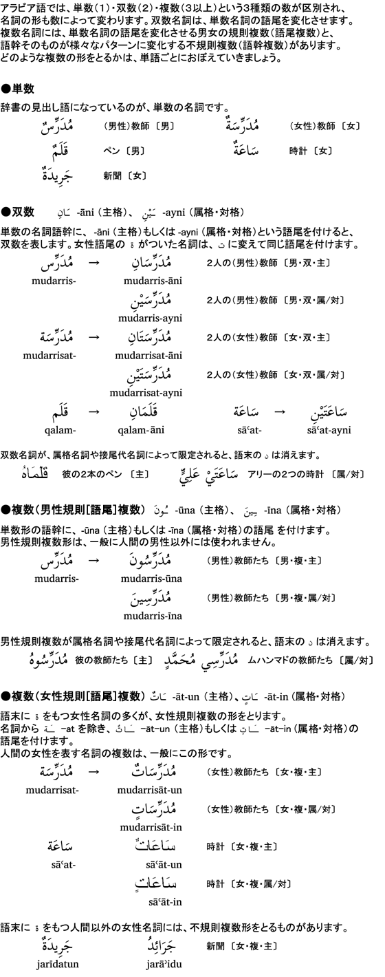 ここでは、1.初対面の会話表現、2.名詞の性、3.名詞の数の3項目について解説しています。第3課と第4課で名詞の基本を学びます。細かな規則や暗記事項がたくさんありますが、まずはアラビア語の名詞の全体的な特徴をつかんでください。後の練習問題にも取り組みましょう。