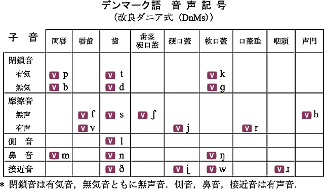 デンマーク語の子音表に挙げられている各子音に付けられている V をクリックすると,当該子音を含む単語が3つ発音されます.