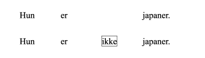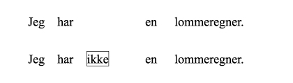 次に肯定平叙文から否定平叙文を作ってみましょう.肯定平叙文を否定平叙文にするためには,否定の副詞ikkeを使いますが,ikkeの置かれる位置に注意してください.