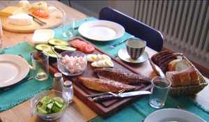 デンマーク人にとってジャガイモと同様に大切な食べ物はパンです.デンマーク人は白パンと黒パン,両方ともよく食べます.小麦がベースの白パンは普通朝食の食卓に上ります.バターやジャムを塗って,近頃は子供がこれに薄いチョコレート載せて食べています.それに対して,ライ麦がベースの黒パンは昼食の典型的な食材です.スマアアブレズsmørrebrød(オープンサンドイッチのこと)といって,薄くスライスした黒パンの上に小エビやローストビーフ,魚のフライなど,さまざまな具をのせてオープンサンドイッチのようにして食べます.