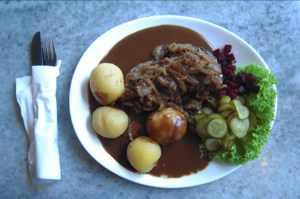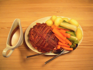 伝統料理の多く,たとえば「ロースト・ポーク (フレスケスタイflæskesteg)」や 「デンマーク風ミニハンバーグ (フリカデレfrikadelle)」や「野ウサギもどき (フォローアン・ハーアforloren hare)」などは豚肉が主たる材料ですが,これらのメインにはたいていブラウンソースとボイルしたジャガイモが添えられ,付け合わせに用いられる典型的な野菜は人参,グリーンピース,カリフラワーです.