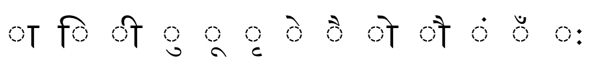 子音字はa以外の母音を従える場合、それぞれの母音は規則的な形をとり、以下のように一種の母音記号として子音字に追加されます。(◌は子音字の字母を表す)